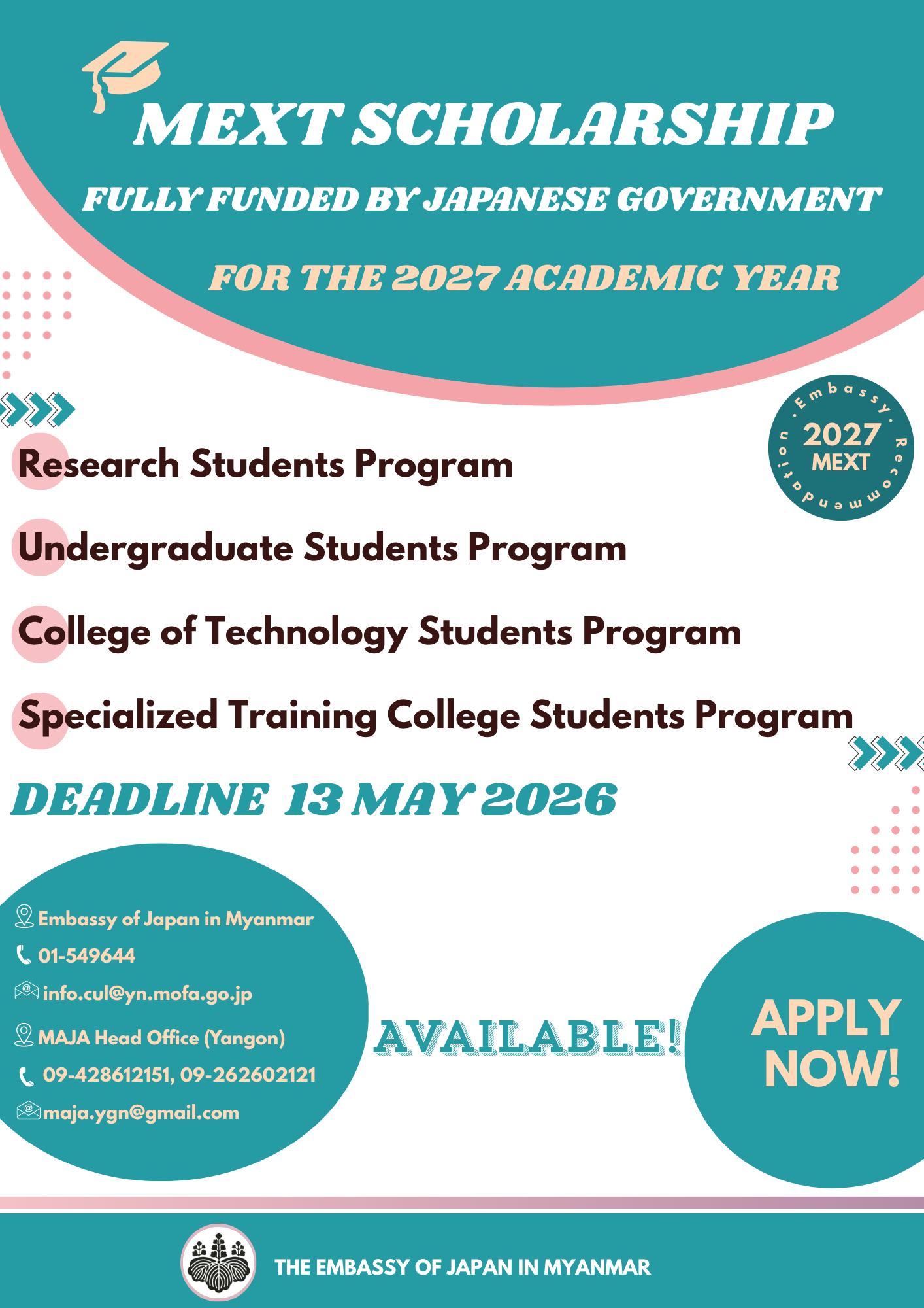 The Government of Japan offers MEXT scholarship program, which is a governmental full scholarship program, to international students who wish to study in Japan. It covers tuition fee, monthly stipend and round-trip ticket from Myanmar to Japan. The Embassy of Japan is pleased to announce that applications for the MEXT Scholarship 2027 intake are open until 13 May.