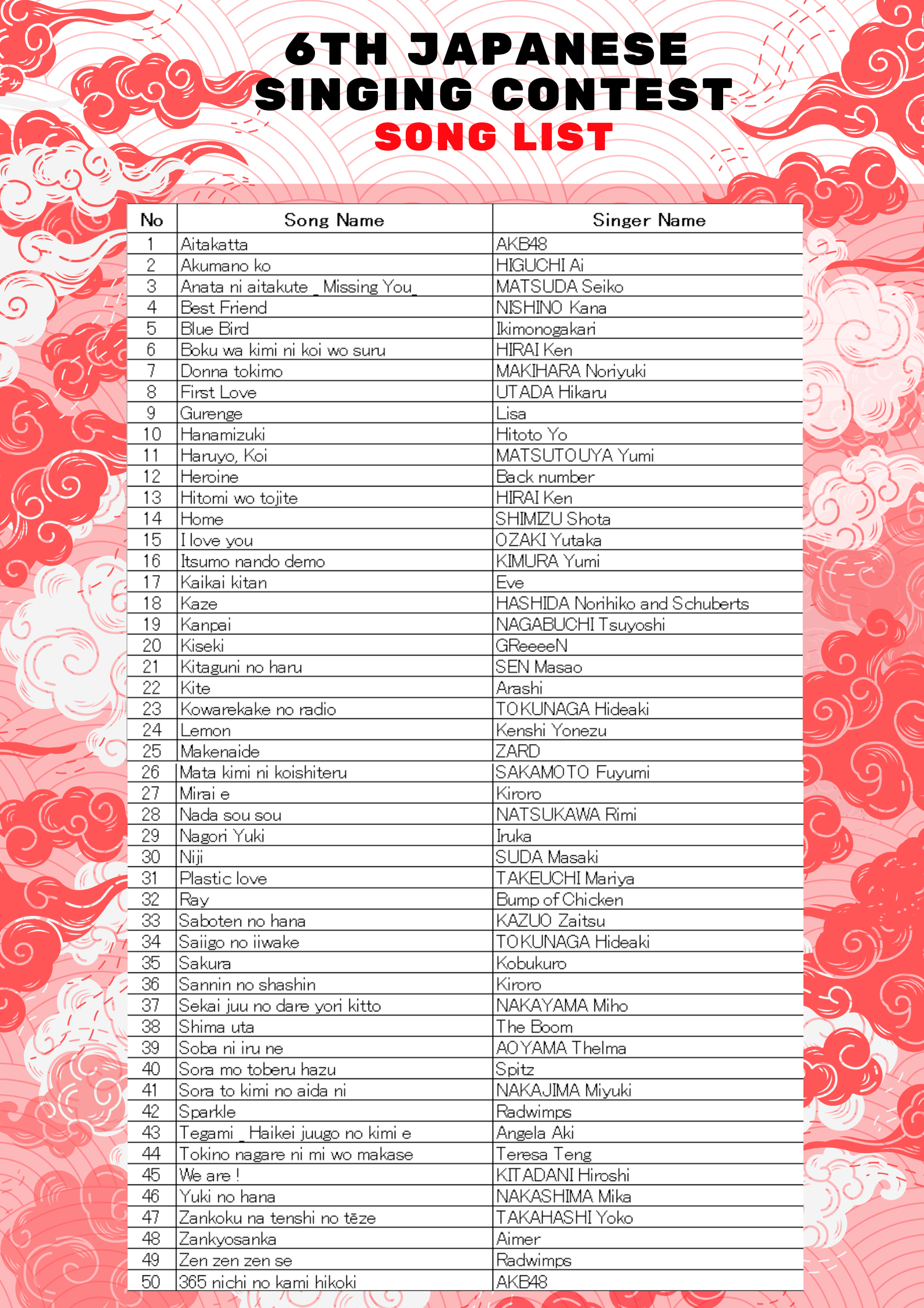 先着100名とします。選定した日本語の歌50曲から1曲を選んで頂き、歌動画(バックミュージック付き又はアカペラ可)を提出して頂きます。なお、歌動画については、ご自身のYouTubeアカウントで、限定公開にてアップロードし、その動画リンクを共有して下さい(アップロード方法は以下※参照)。その後、事務局の予選審査を経て、12名のファイナリストが本選に出場することができます。